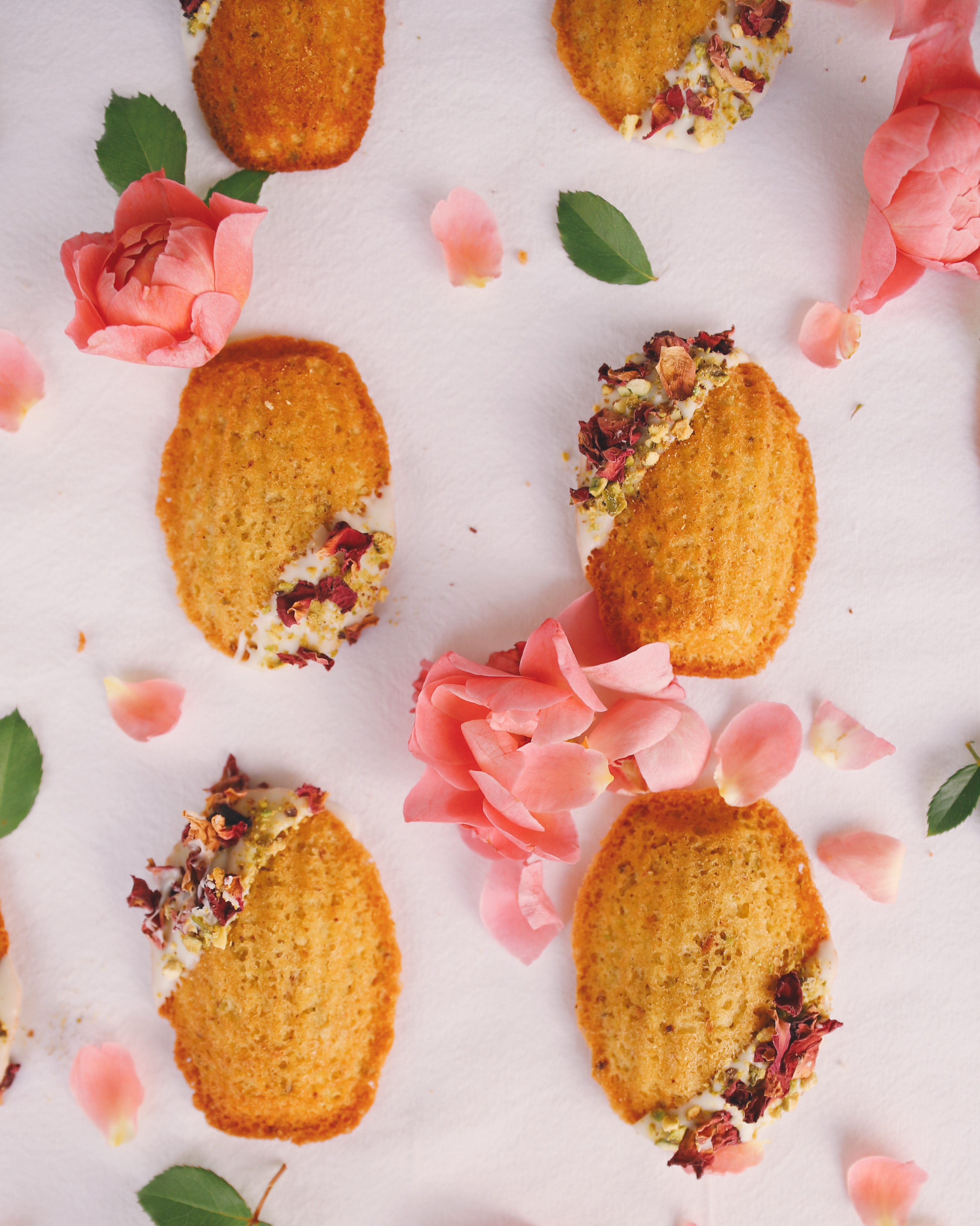 - Dip the top corner of each madeleine in the melted white chocolate. Sprinkle with crushed nuts and dried rose petals.