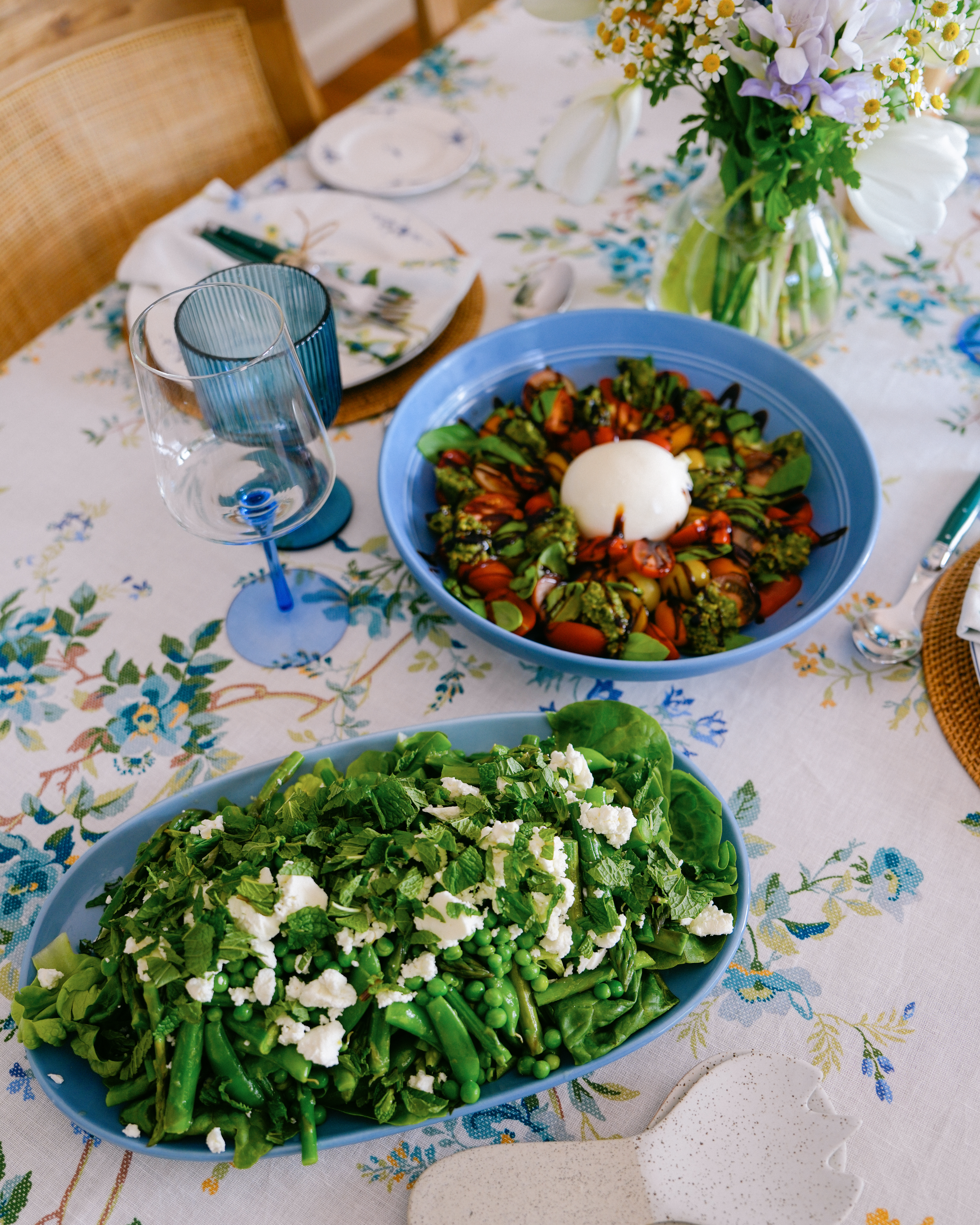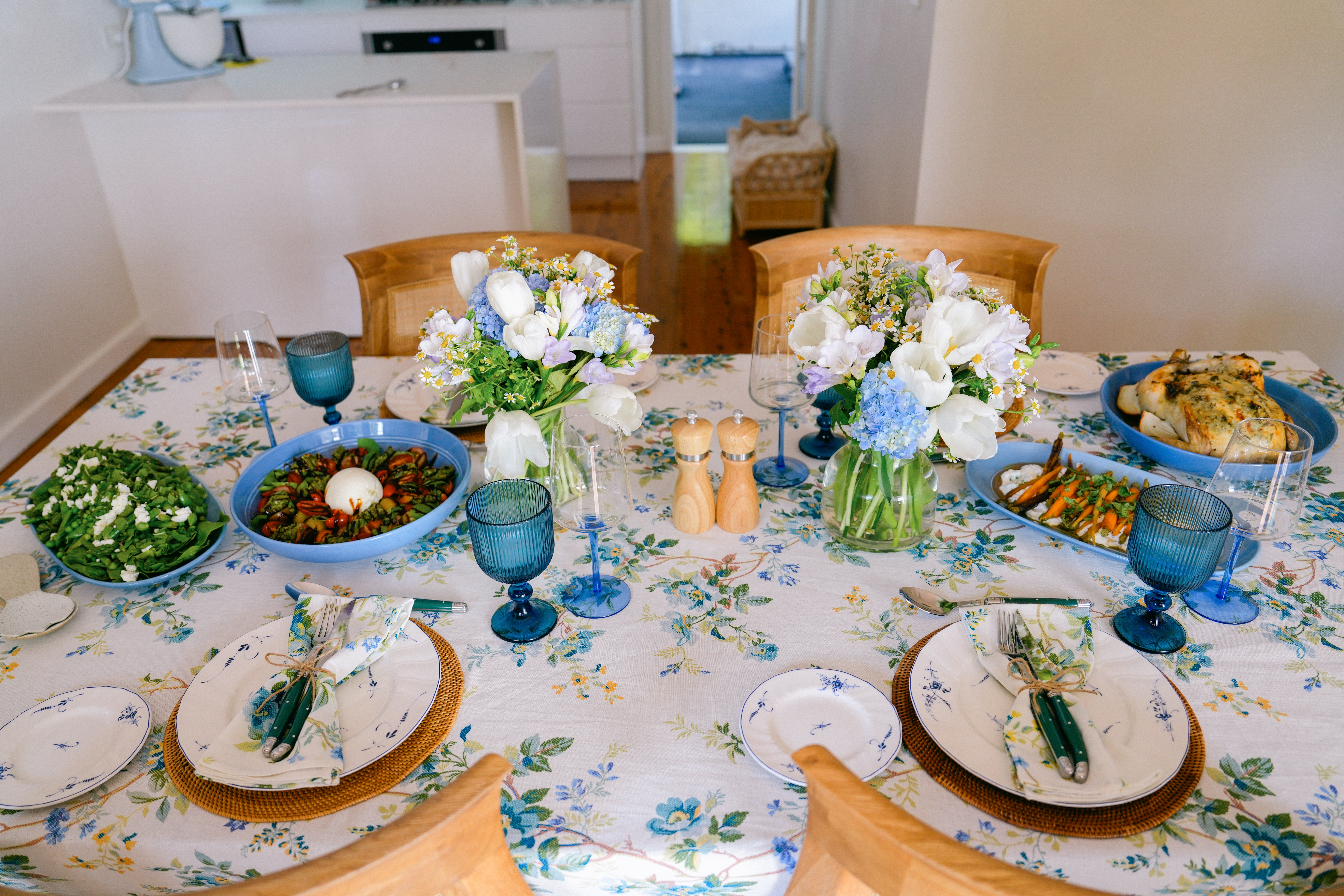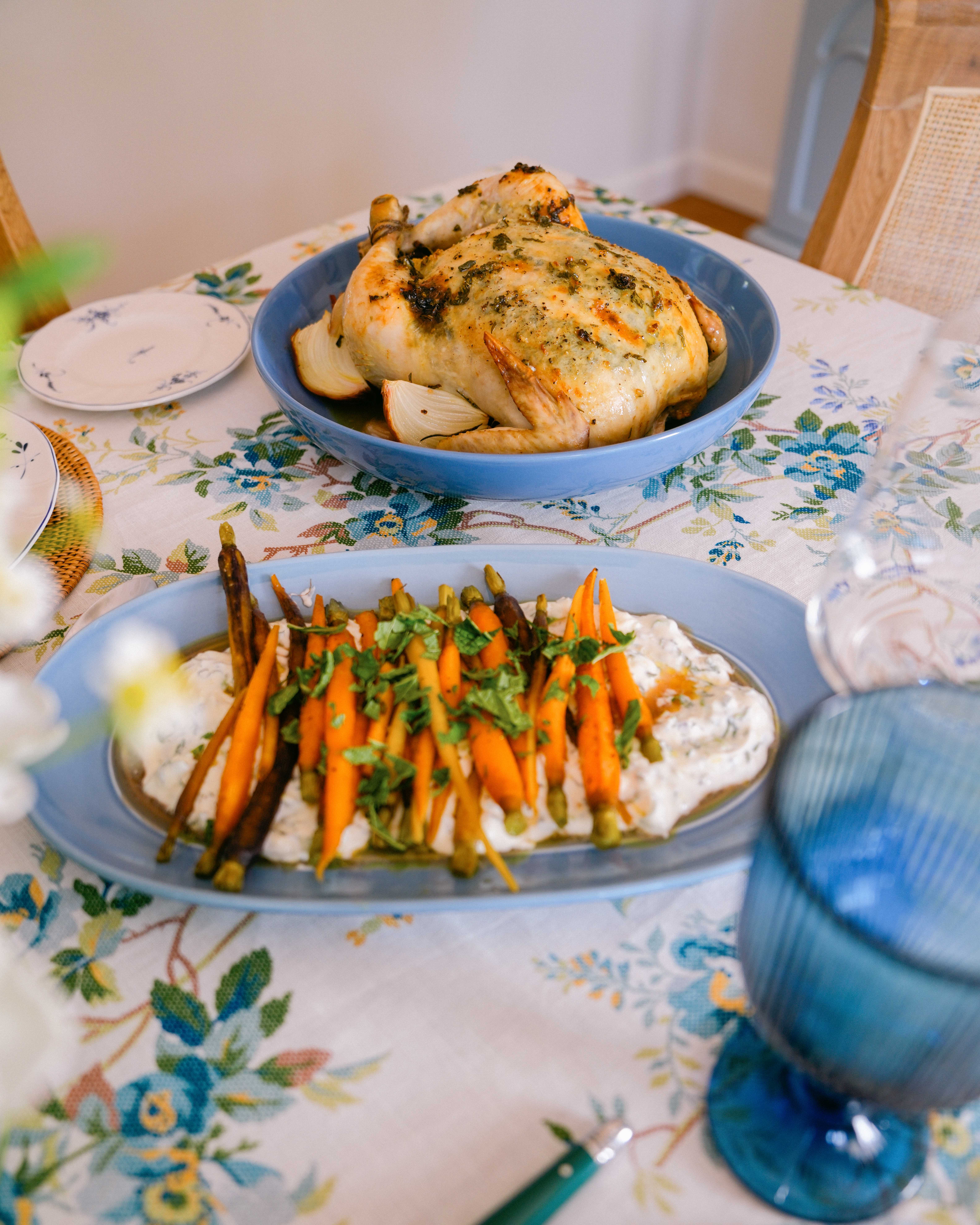 I’m not a huge fan of bunny and egg motifs on my decor, so I try to choose colours and patterns (like florals) that are indicative of the season. When I found this table cloth that was perfect, not only for Easter but for any future long lunch celebrations, I planned everything, including our lunch menu, around that. I made a herb-roasted chicken, a spring green salad, a rainbow baby carrot salad, a burrata salad with homemade pesto, and a lemon and basil olive oil cake with blueberry compote for dessert.
