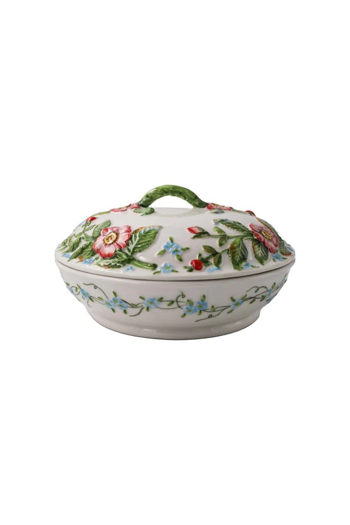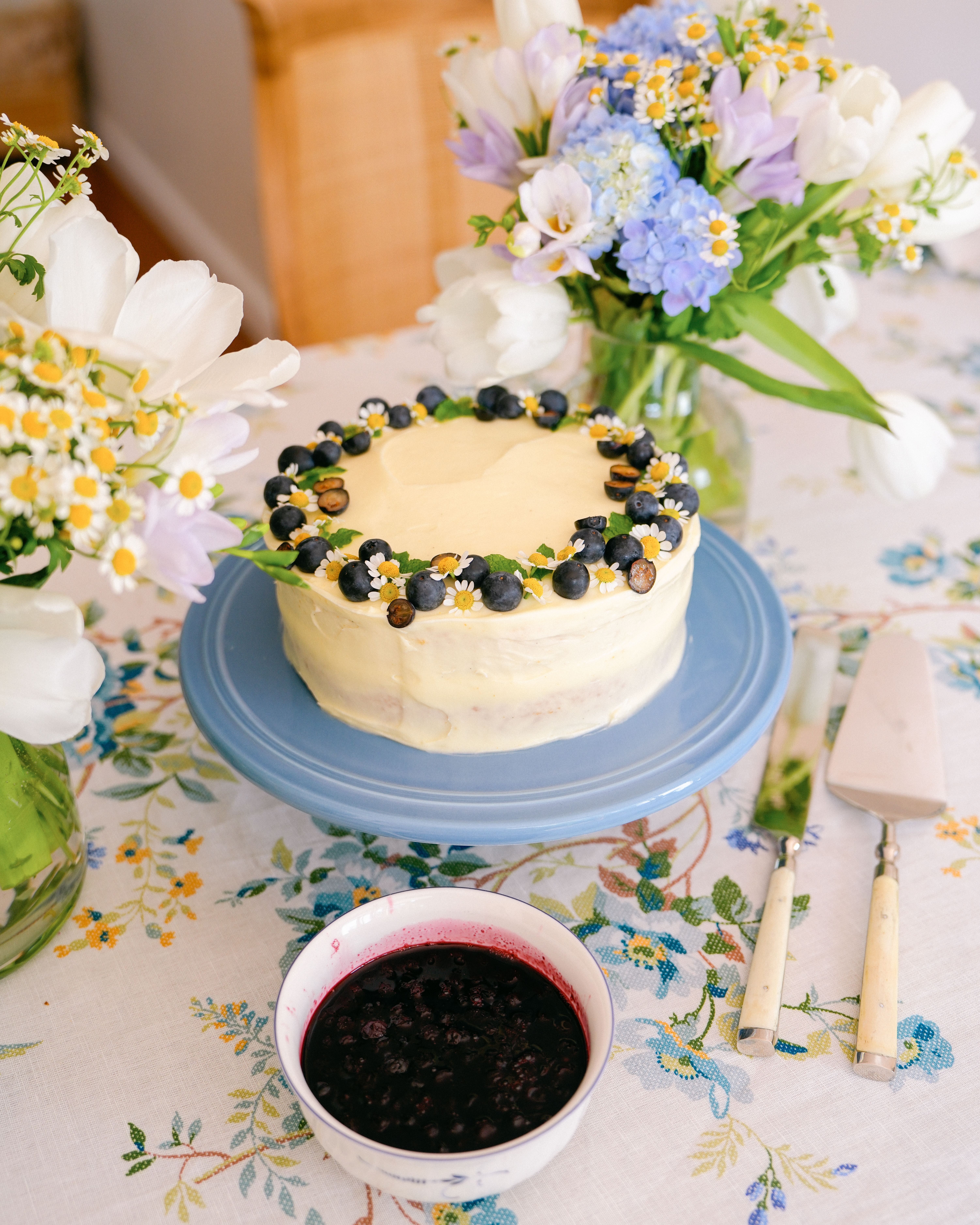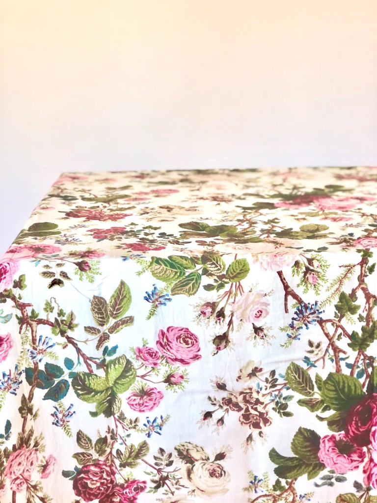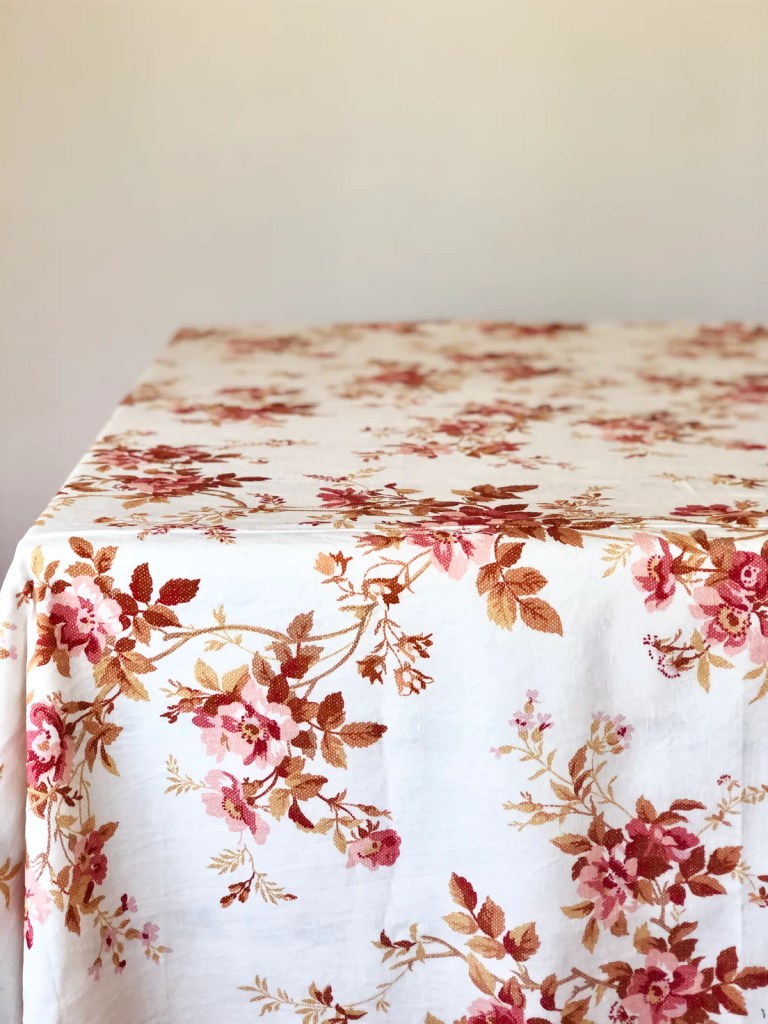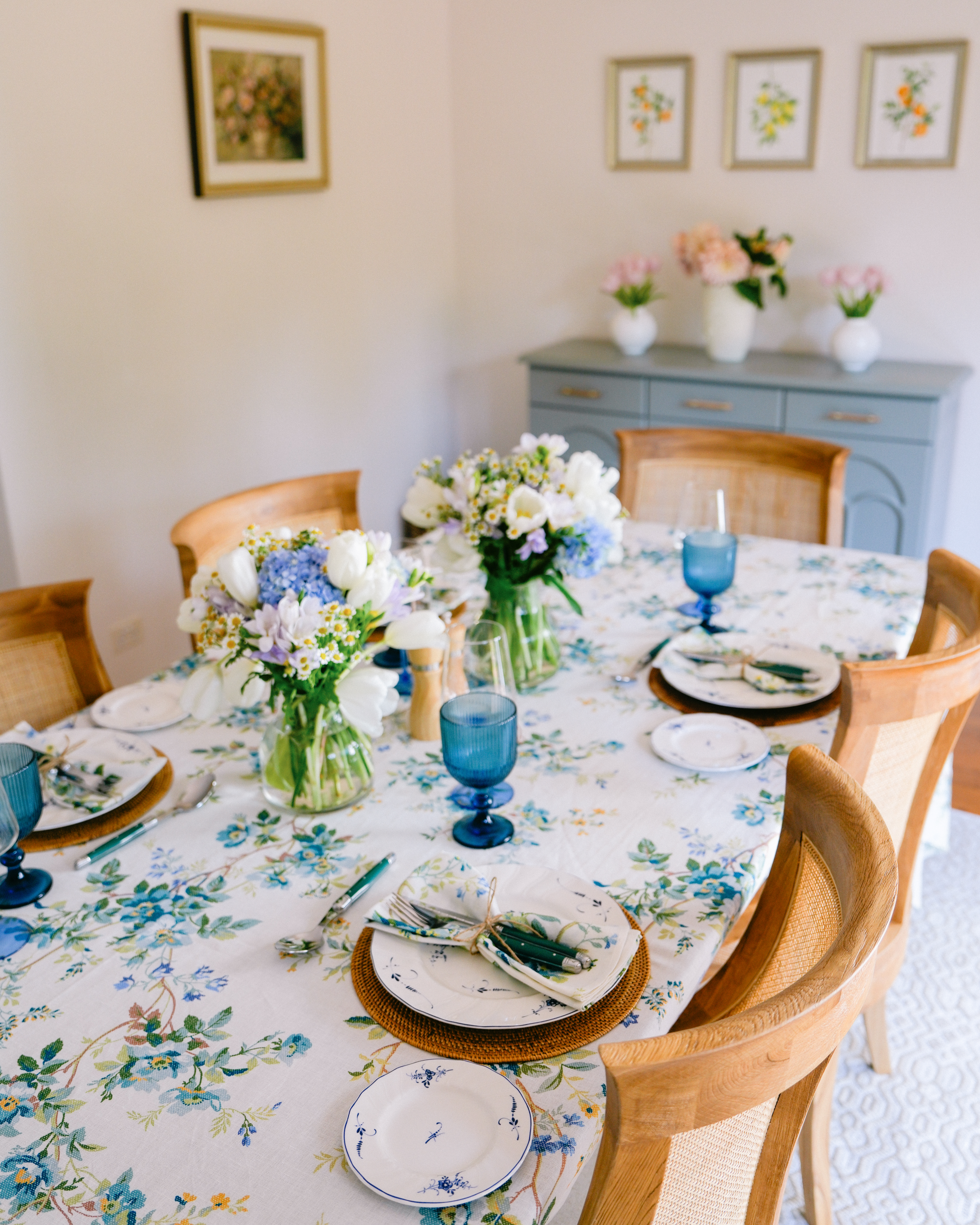 I’m not a huge fan of bunny and egg motifs on my decor, so I try to choose colours and patterns (like florals) that are indicative of the season. When I found this table cloth that was perfect, not only for Easter but for any future long lunch celebrations, I planned everything, including our lunch menu, around that. I made a herb-roasted chicken, a spring green salad, a rainbow baby carrot salad, a burrata salad with homemade pesto, and a lemon and basil olive oil cake with blueberry compote for dessert.